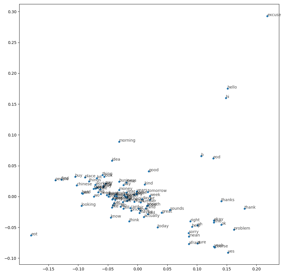 Substitute the word "visualize" for the word "interact" in the program's name (keeping all the other settings is fine) and you'll get a 2-d plot showing a dimensionally-reduced projection of the embeddings onto a flat space. Here's the result for the daily dialog corpus, often used to train chatbots: